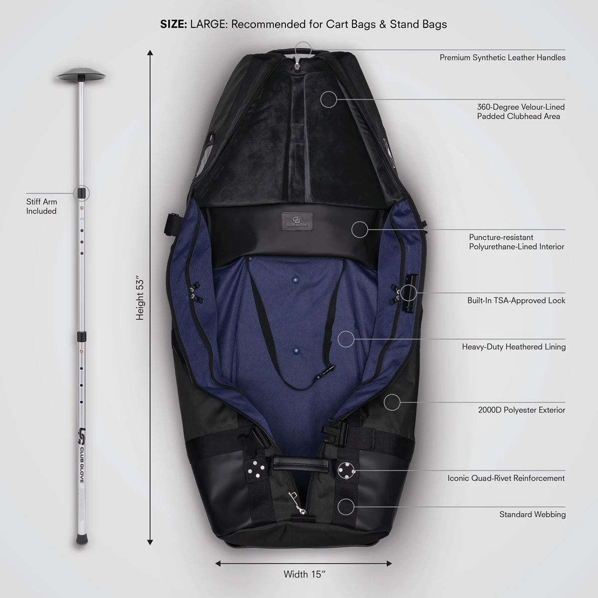 The included Stiff Arm is the same adjustable telescoping rod used in the College and Tour models. It extends taller than your longest club, deflecting downward force away from clubheads and shafts. With proper packing and the Stiff Arm deployed, Club Glove's real-world track record — across touring professionals checking bags 30-plus times per year — shows that club breakage during travel is extremely rare. The Pro doesn't have the Tour's 360-degree velour-lined memory foam or TSA combination lock, but the core protection system is fundamentally the same.
