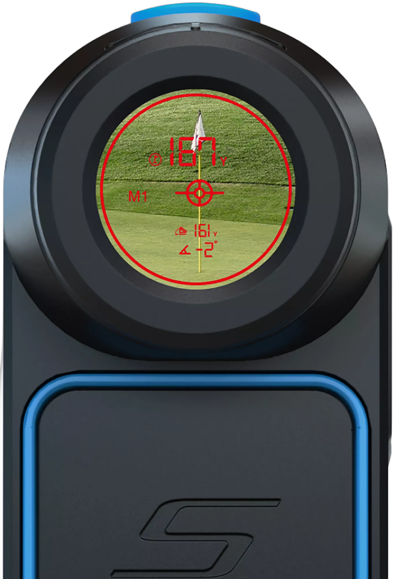 On top, three buttons control power, mode selection (golf mode versus scan mode), and display color switching between red and black optics. The slope toggle sits on the side with a tactile switch that is easy to operate without looking. The color-switching feature is genuinely useful. I found the red display easier to read against dark backgrounds like tree lines, while the black display offered sharper contrast in bright sunlight. Having both available at the press of a button is a practical advantage over single-display competitors.