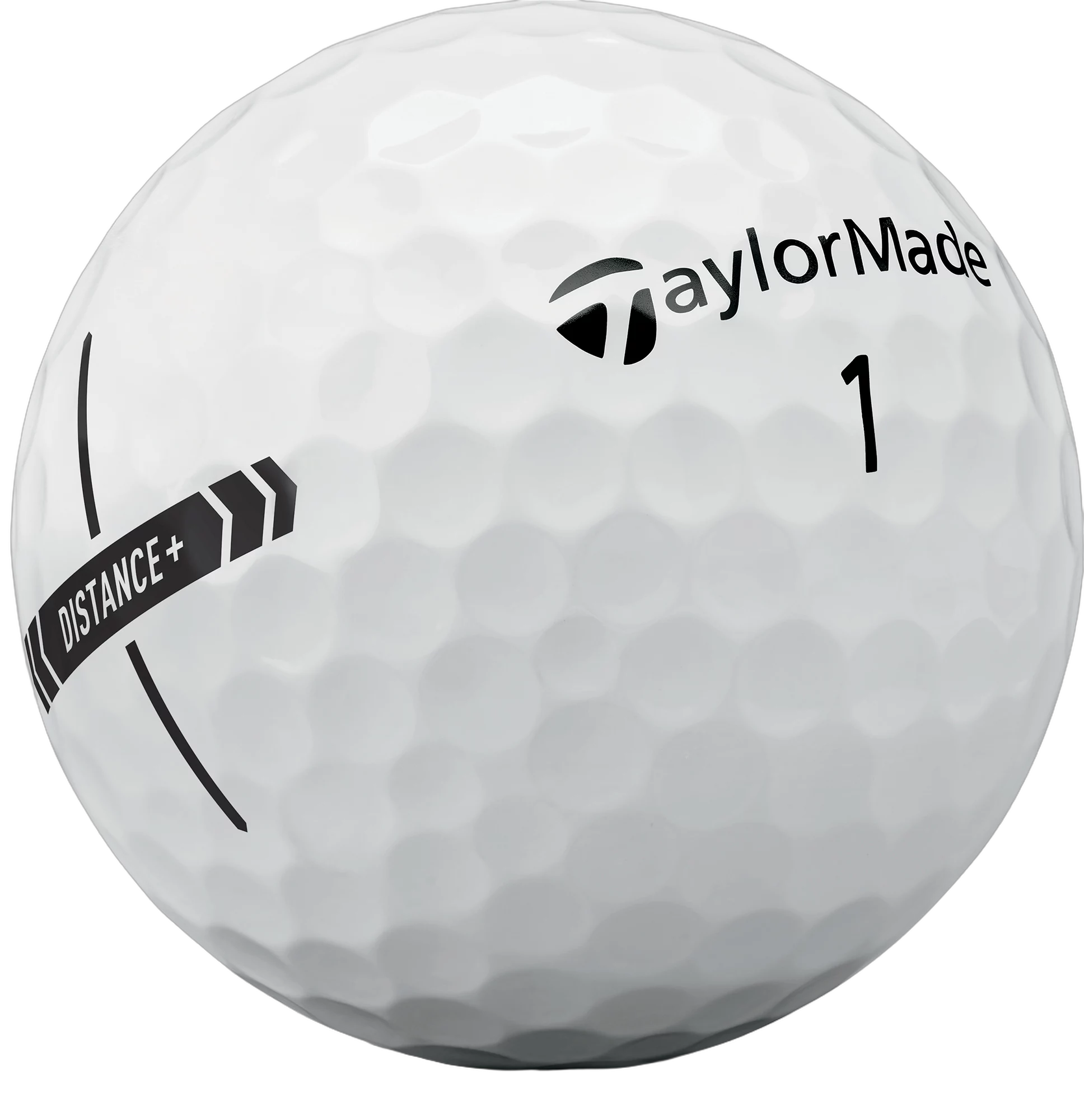 TaylorMade Distance+ ball showing logo, number, and alignment line