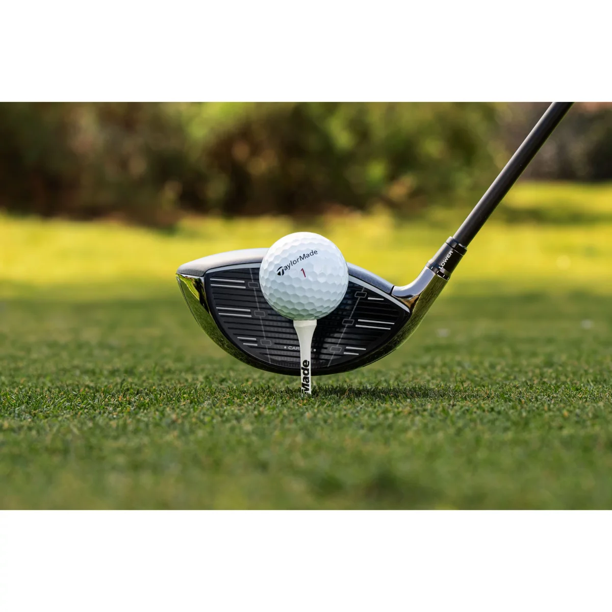 Driver positioned behind ball on tee at address on grass